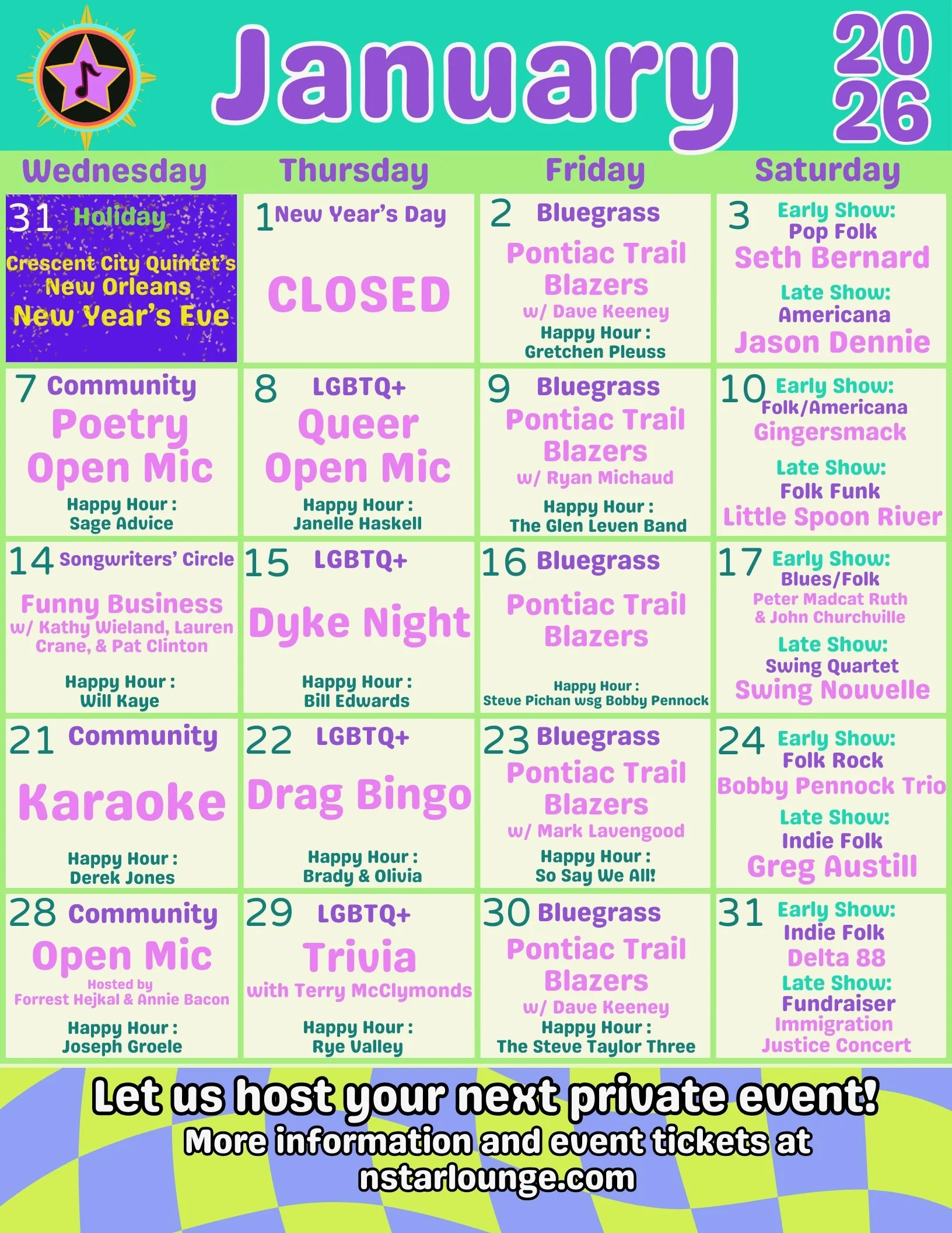 Weds community & open mic • Thurs Lgbtq night • fri bluegrass• sat ticketed shows